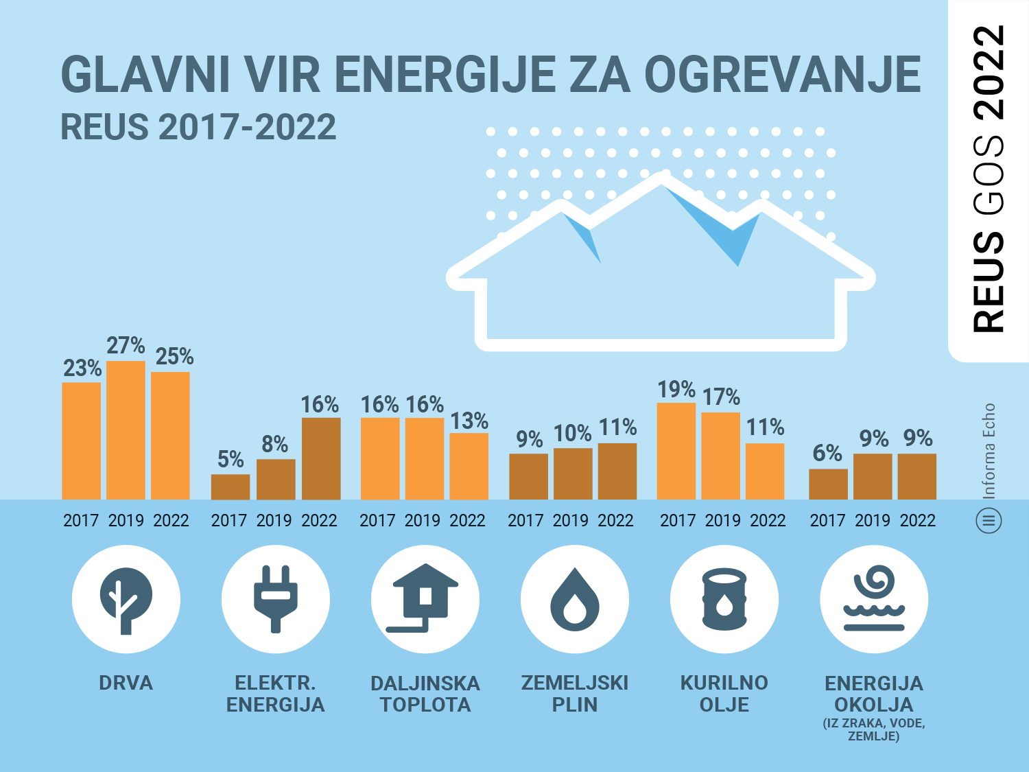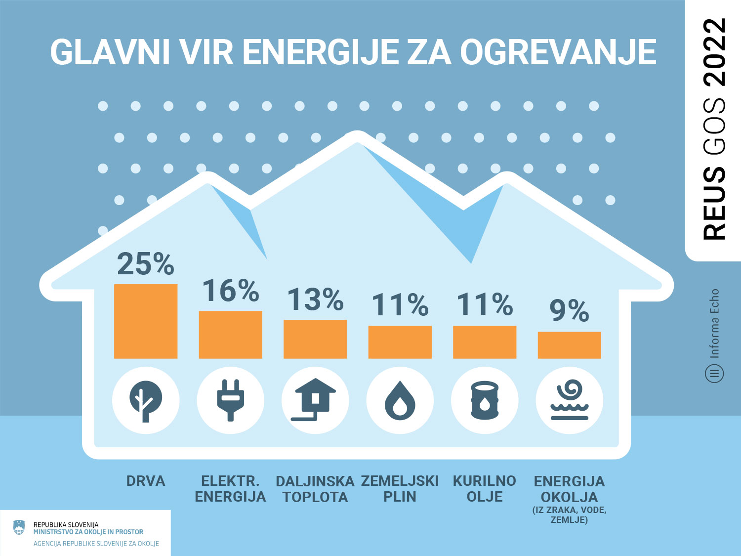 Raziskava energetske učinkovitosti Slovenije – REUS 2022 kaže, da na območju Slovenije drva ostajajo glavni vir energije za ogrevanje, saj so glavni energent za četrtino anketiranih slovenskih gospodinjstev, ki v povprečju polovico drv kupijo in drugo polovico pridobijo sama. Sledijo energija okolja, daljinska toplota, električna energija, kurilno olje in zemeljski plin – vsakega od teh energentov uporablja dobra desetina gospodinjstev.